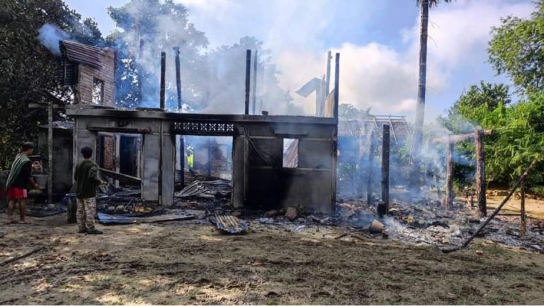 ပုံစာ – မီးရှို့ဖျက်ဆီးခံလိုက်ရသည့် ထန်းပင်ကုန်းကျေးရွာမှ နေအိမ်များ