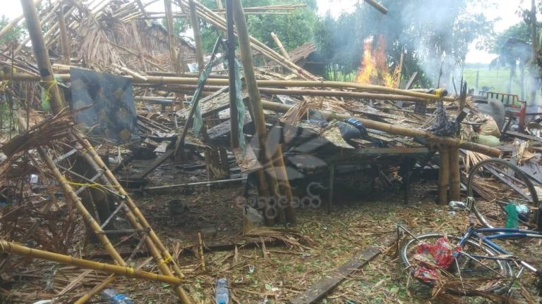 ပုံစာ – ဒရုန်းဖြင့်တိုက်ခိုက်မှုကြောင့် ပျက်စီးခဲ့ရသည့် လေးအိမ်စုကျေးရွာကနေအိမ်။ ဓာတ်ပုံ – ပေးပို့။