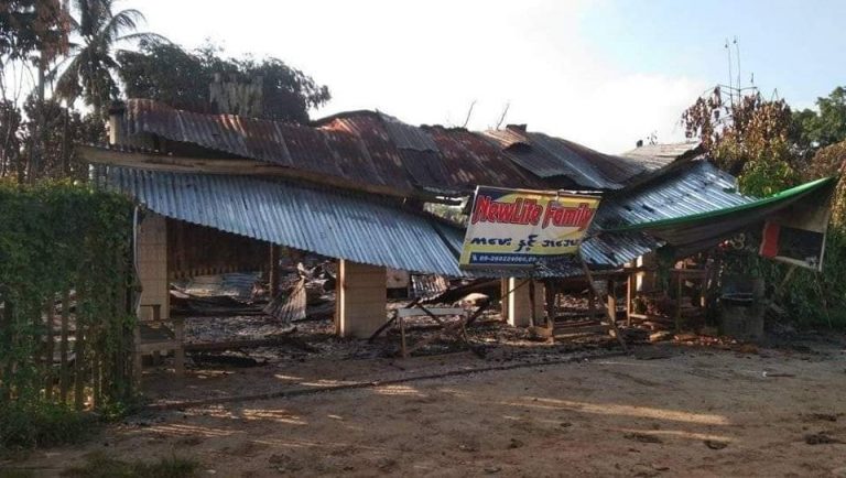 ပုံစာ – လေကြောင်းတိုက်ခိုက်မှုနှင့် မီးရှို့ဖျက်ဆီးမှုများကြောင့် ပျက်စီးခဲ့သည့် အောင်းကုန်းကျေးရွာရှိ နေအိမ်များ