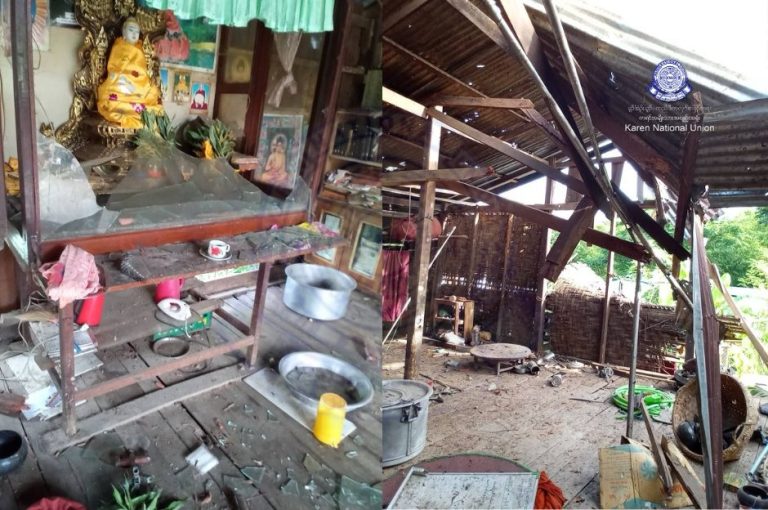 ပုံစာ − စစ်ကောင်စီတပ်၏ လက်နက်ကြီးပစ်ခတ်မှုကြောင့် ထိခိုက်ဒဏ်ရာ ရရှိမှုများနှင့် ပျက်စီးဆုံးရှုံးမှုများ။( ဓာတ်ပုံ – KNU )