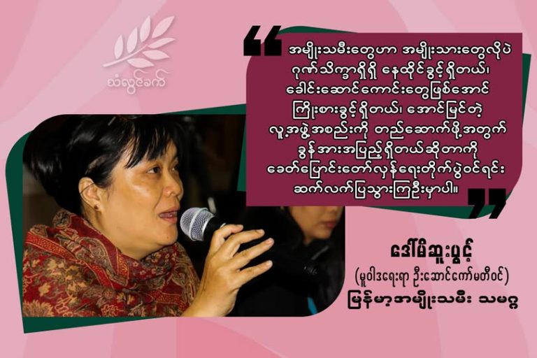 မေး။ ။ အမျိုးသမီးတွေက တော်လှန်ရေးထဲမှာ ထဲထဲဝင်ဝင် ပါဝင်လာခြင်းနဲ့အတူ ပဋိပက္ခနယ်မြေတွေမှာလည်း အမျိုးသမီးတွေကို လိင်ပိုင်းဆိုင်ရာ အကြမ်းဖက်တာ၊ အတင်းဓမ္မ ဖမ်းဆီးတာတွေကို စစ်ကောင်စီအပါအဝင် တော်လှန်ရေး အဖွဲ့တွေကပါလုပ်နေတဲ့အပေါ်ဘယ်လို့ သုံးသပ်ချင်ပါလဲ။ ဒါတွေကို ဘယ်လို့ဖြေရှင်းသင့်ပါသလဲ။