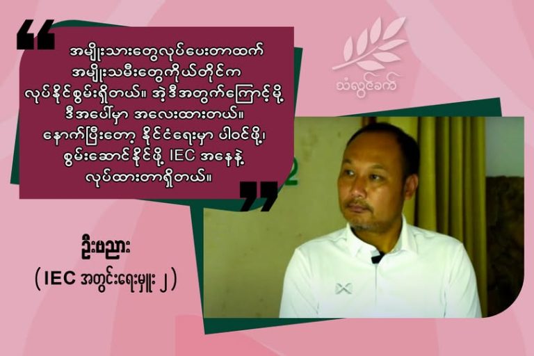 ဖြေ။။အမျိုးသမီးတွေအနေနဲ့နိုင်ငံရေးမှာအနစ်သာရရှိပြီးပါဝင်လာနိုင်တဲ့ပုံစံကိုကြည့်ပြီးကြိုးစားလာတာပေါ့၊ကြိုးစားလည်းကြိုးစားနေတယ်ဖြစ်လည်းဖြစ်သင့်တယ်ဖြစ်လည်းဖြစ်ရမှာပေါ့။တော်လှန်ရေးမှာကြည့်မယ်ဆိုရင်ထိခိုက်နစ်နာသူအများစုကအမျိုးသမီးနဲ့ကလေးတွေဖြစ်တယ်အဲတော့အမျိုးသမီးတွေနဲ့ကလေးတွေရဲ့ခံစားချက်တွေအခြေခံအခွင့်အရေးတွေကာကွယ်နိုင်ဖို့ရန်ဒီပလပ်ဖောင်းမှာပိုပြီးရေချိန်တက်လာဖို့အတွက်သေချာတာတစ်ခုကတော့အမျိုးသမီးကိုယ်တိုင်ကလုပ်နိုင်စွမ်းရှိတယ်ကျွန်တော်တို့အမျိုးသားတွေလုပ်ပေးတာထက်စာရင်အဲဒီအတွက်ကြောင့်မို့ဒီအပေါ်မှာအလေးထားတယ်၊နောက်ပြီးတော့မှပိုပြီးတော့မှာနိုင်ငံရေးမှာပါဝင်ဖို့စွမ်းဆောင်နိုင်ဖို့IECအနေနဲ့လုပ်ထားတာရှိတယ်တချို့အရပ်ဖက်အဖွဲ့အစည်းနဲ့ပေါင်းစပ်ညိုနှိုင်းပြီးတော့မှ အမျိုးသမီးခေါင်းဆောင်မှု သင်တန်းတွေလုပ်ပေးနေတာမျိုးလည်းရှိပါတယ်။ အဲတော့ စဉ်ဆက် မပျက်တော့လုပ်နေတယ်လို့ ပြောလို့ရတာ ပေါ့နော်။ အထူးသဖြင့် နိုင်ငံရေးမှာ အမျိုးသမီးစွမ်းရည် ပိုပြီးမြင့်တက်လာအောင်ပေါ့။