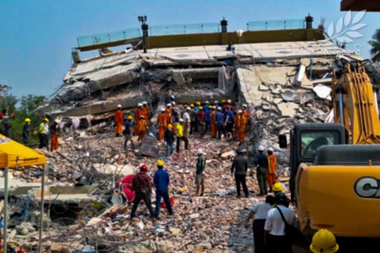 ပုံစာ – မန္တလေးရှိ ပြိုကျအဆောက်အအုံတစ်ခုတွင် ကယ်ဆယ်ရေးလုပ်ဆောင်နေသည့် မြင်ကွင်း (ဓာတ်ပုံ – သံလွင်ခက်)