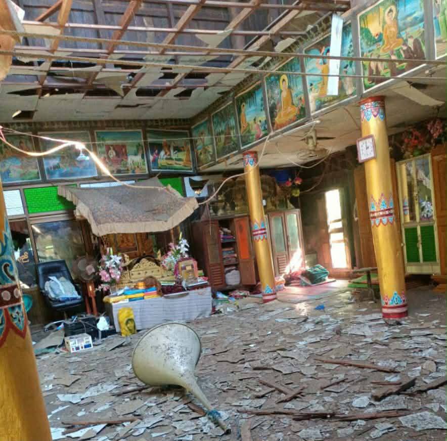 ထိုသို့ စစ်တပ် ဒရုန်းဗုံးဖြင့် တိုက်ခိုက်မှုကြောင့် အင်တိုင်ကျေးရွာတွင် ဘုန်းကြီးကျောင်း ခေါင်မိုး၊ နံရံများနှင့် သံဃာဆောင်များလည်း ပျက်စီးခဲ့သည်။ ကျောက်ကလေရွာ ဘုန်းကြီးကျောင်းကိုလည်း အသေခံဒရုန်းများဖြင့် ထပ်မံ ဗုံးကြဲတိုက်ခိုက်ခဲ့သည့်အတွက် ဘုန်းကြီးကျောင်းဆောင် ပျက်စီးသွားခဲ့သည်။