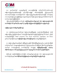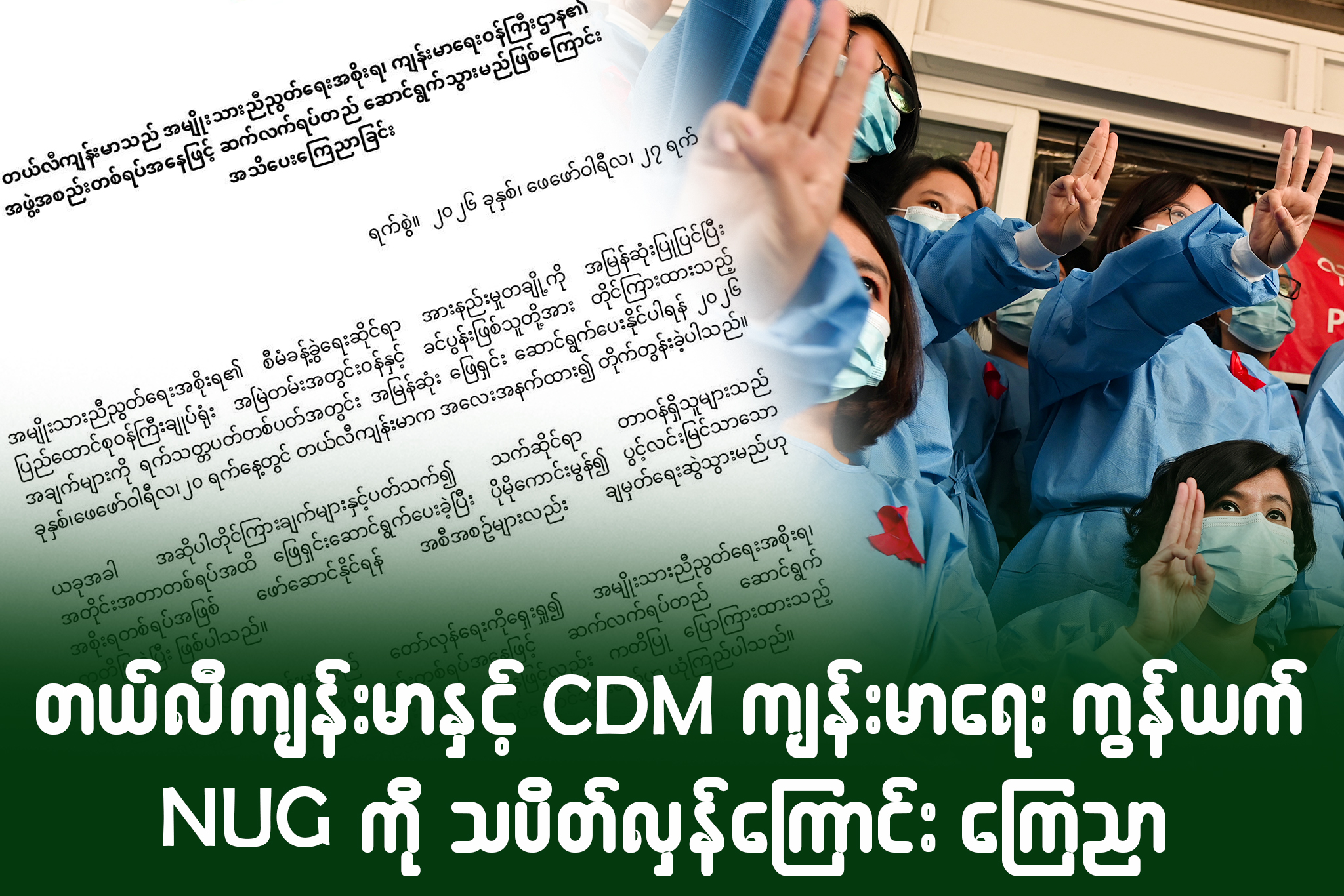 CDM ကျန်းမာရေးကွန်ယက်အနေဖြင့်လည်း ၎င်းတို့ တင်ပြထားသည့် အချက် ၆ ချက်ပါ တောင်းဆိုချက်များနှင့် ပတ်သက်၍ NUG ပြည်ထောင်စုဝန်ကြီးချုပ် လက်မှတ်ရေးထိုးထားသော အကြောင်းပြန်စာကို ဖေဖော်ဝါရီ ၂၅ ရက်တွင် လက်ခံရရှိခဲ့သည်ဟု သိရသည်။ ထို့နောက် အဖွဲ့အတွင်း ဒီမိုကရေစီနည်းလမ်းကျ ဆန္ဒကောက်ယူခဲ့ပြီး ပူးပေါင်းဆောင်ရွက်မှု ရပ်တန့်ထားခြင်းကို ရုပ်သိမ်းရန် ဆုံးဖြတ်ခဲ့ကြခြင်းဖြစ်သည်ဟု ဖော်ပြထားသည်။