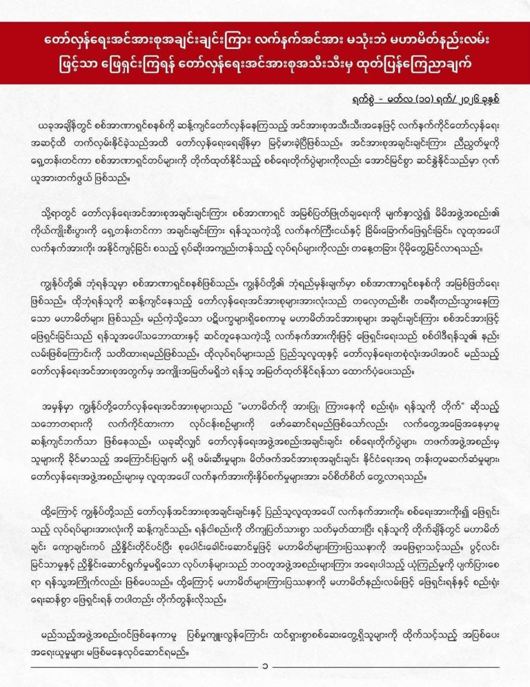 ယခုအချိန်သည် စစ်ကော်မရှင်၏ အာဏာရှင်စနစ်ကို အမြစ်ပြတ်ချေမှုန်းရန် အဆုံးအဖြတ်ပေးရမည့် အချိန်ဖြစ်သော်လည်း အင်အားစုအချို့အကြား မိမိတို့အဖွဲ့အစည်းအကျိုးစီးပွားကို ရှေ့တန်းတင်ကာ ရန်သူသဖွယ် ဆက်ဆံလာခြင်း၊ လူထုအပေါ် လက်နက်အားကိုး အနိုင်ကျင့်ခြင်းများ ပိုမိုတွေ့ရှိလာရကြောင်း အဆိုပါထုတ်ပြန်ချက်တွင် ထောက်ပြထားသည်။
