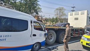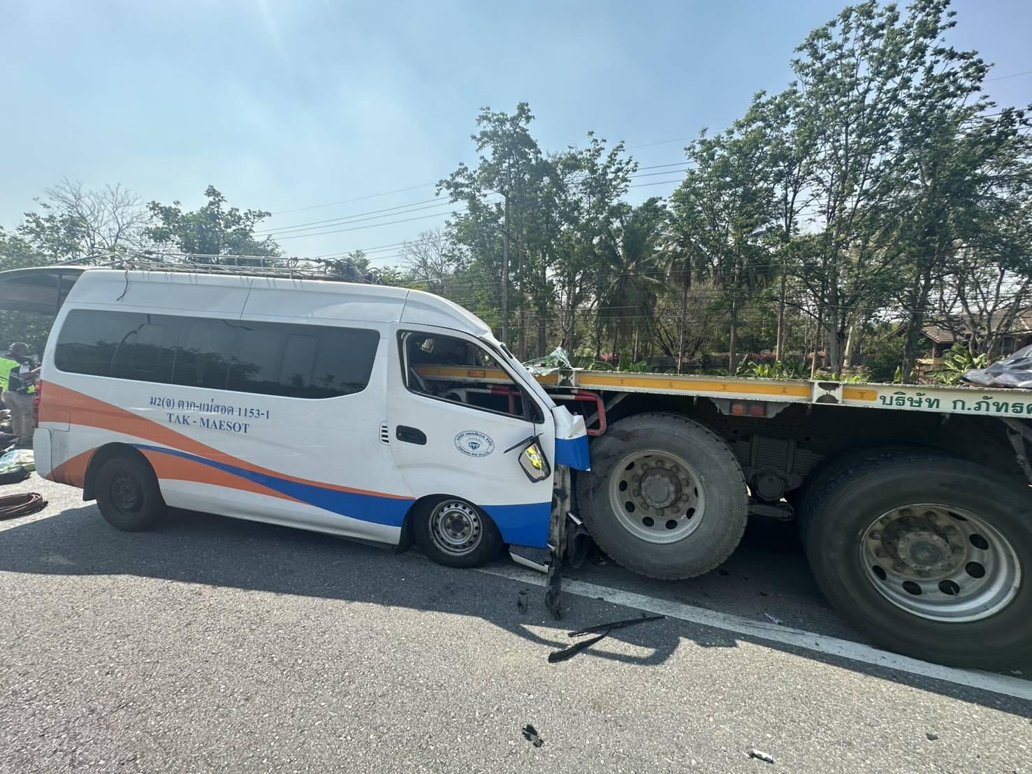 ထိုင်း-မြန်မာနယ်စပ် တက်-မဲဆောက် အဝေးပြေးလမ်းမကြီးပေါ်တွင် ယနေ့ညနေပိုင်းက ခရီးသည်တင်ဗန်ကားတစ်စီးနှင့် ဆယ်ဘီးကုန်တင်ကားတို့ ပြင်းထန်စွာ တိုက်မိခဲ့ရာ လူ ၅ ဦး နေရာ၌ပင် သေဆုံးပြီး ၉ ဦး ဒဏ်ရာရရှိခဲ့သည့် ဖြစ်စဉ်တစ်ခု ဖြစ်ပွားခဲ့သည်။