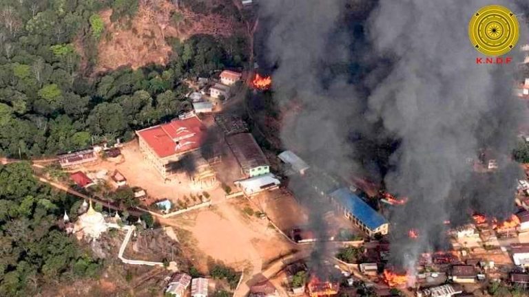 ပုံစာ–မတ်လ ၁၁ ရက်တွင် နမ်းနိန်းကျေးရွာကိုစစ်ကောင်စီတပ်က မီးရှို့ဖျက်ဆီးမှု ။