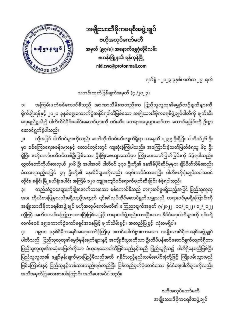 စစ်ကောင်စီလက်အောက်ခံ ရွေးကောက်ပွဲကော်မရှင်အနေဖြင့် တရားဝင်ဖွဲ့စည်းပြီးသား နိုင်ငံရေးပါတီများကိုဖျက်သိမ်းခွင့်မရှိကြောင်း အမျိုးသားဒီမိုကရေစီအဖွဲ့ချုပ် ဗဟိုအလုပ်မှုဆောင်ကော်မတီက ယနေ့တွင်ထုတ်ပြန်ကြေညာလိုက်သည်။