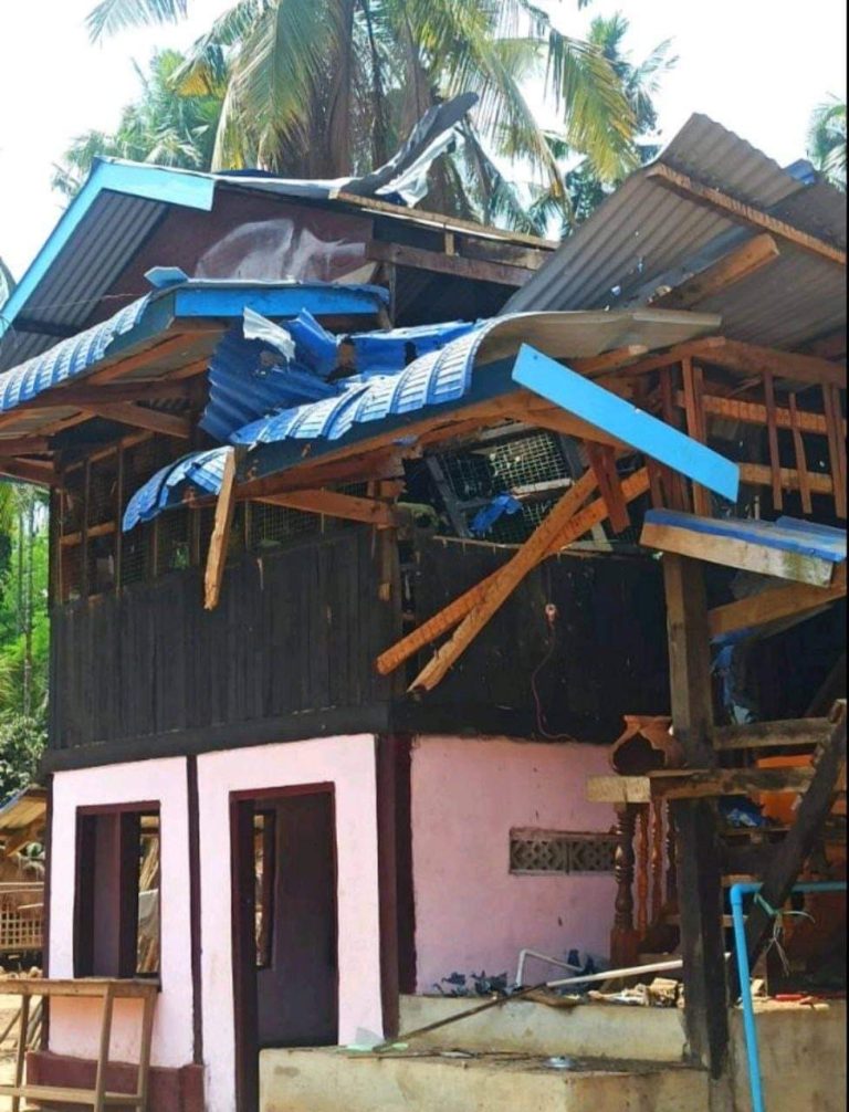 ပုံစာ–စစ်ကောင်စီတပ်လက်နက်ကြီးပစ်ခတ်မှုကြောင့် သထုံမြို့နယ်တောင်ကလေးကျေးရွာရှိနေအိမ်ပျက်စီးမှု။