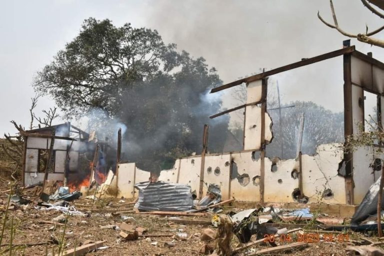 ပုံစာ– လေကြောင်းမှ ဗုံးကြဲတိုက်ခိုက်ခံရမှုကြောင့် ထီးလင်းမြို့နယ် ပအဖရုံး မီးလောင်ပျက်စီးမှု။