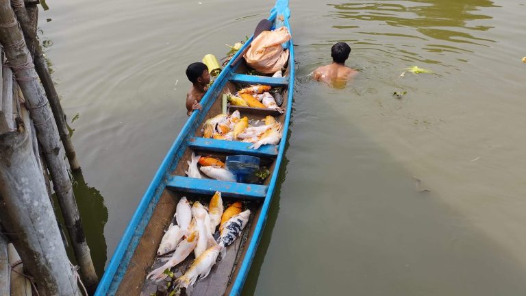 ပုံစာ – နိဗ္ဗာန်ချမ်းသာ မင်္ဂလာကန်ထဲမှ သေဆုံးနေသည့် ငါးများကို ဆယ်ယူမှုများလုပ်ဆောင်နေသည့် မြင်ကွင်း
