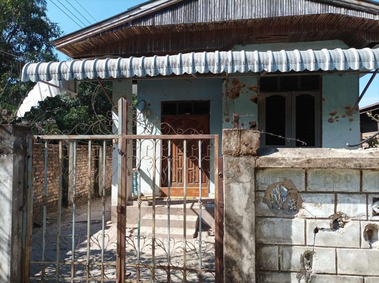 ပုံစာ – ဖေဖော်ဝါရီ ၂ ရက်၊ စစ်ကောင်စီလက်နက်ကြီးပစ် ခတ်မှုကြောင့် နေအိမ် ၁ လုံးပျက်စီးမှု အခြေအနေ။