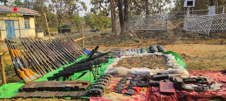 ပုံစာ – မောင်တောမြို့ အောင်သပြေနယ်ခြားစောင့်တပ်စခန်းသိမ်းတိုက်ပွဲက သိမ်းပိုက်ရရှိခဲ့သည့် လက်နက်ခဲယမ်းများ။