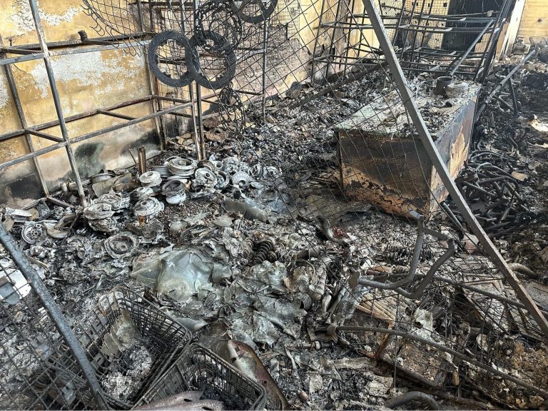 ပုံစာ – မတ်လ ၂၈ ရက်၊ ညပိုင်းတွင် လက်နက်ကြီးကျရောက်ပေါက်ကွဲမှုကြောင့် ပျက်ဆီးသွားသည့် ဆိုင်ကယ်ပြင်ဆိုင်။