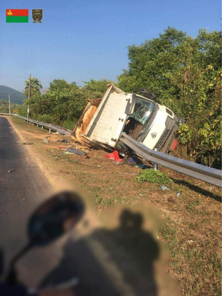 ပုံစာ – ကြားဖြတ်တိုက်ခိုက်မှုကြောင့်တိမ်းမှောက်ခဲ့သည့် စစ်ကောင်စီတပ်သားများလိုက်ပါလာသည့် မြေတင် ကားမြင်ကွင်း။