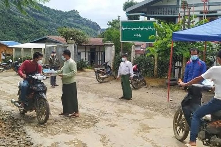 ပုံစာ – လေရှီးမြို့နယ်တွင် မြို့နယ်ထွေအုပ်ရုံးမှ ဒေသခံများအား စစ်မှုထမ်းဥပဒေနှင့်ပတ်သတ်သည့် လက်ကမ်းစာစောင် ဝေနေသည့်မြင်ကွင်း(CJ)