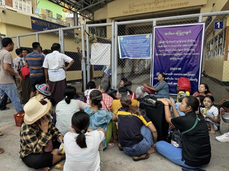 ဓာတ်ပုံ- ဧပြီ ၂၁ ရက် မြဝတီ မဲဆောက် ချစ်ကြည်ရေးတံတားအမှတ် ၁ မြန်မာဘက်ခြမ်းတွင် ဝင်ရောက်ရန် စောင့်ဆိုင်းနေသော ပြည်သူများ (သံလွင်ခက်)