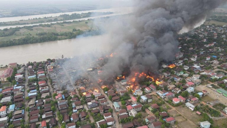 ပုံစာ – စစ်ကောင်စီလေကြောင်းမှဗုံးကြဲတိုက်ခိုက်မှုကြောင့် မီးလောင်ပျက်စီးခဲ့သည့် ဓမ္မသကျေးရွာမြင်ကွင်း။